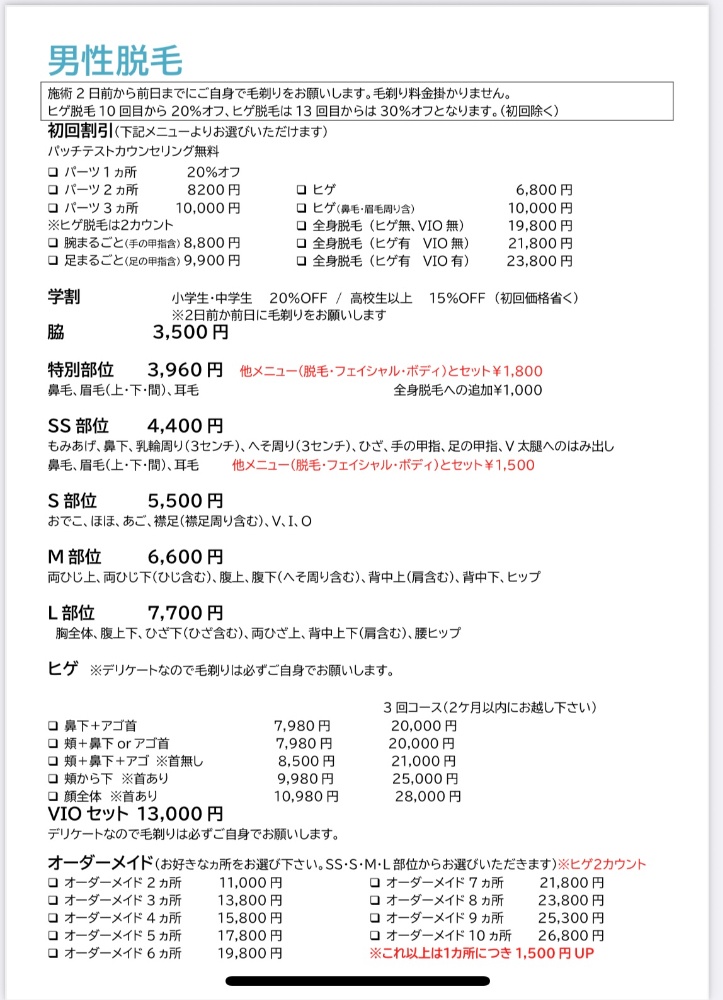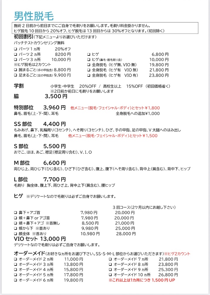 | 営業時間 | 女性施術 10:00〜20:00 (最終受付はメニューによりますが17:00~19:30) 定休日 月曜日、火曜日 男性脱毛 10:00〜22:00 定休日 臨時休業のみ |